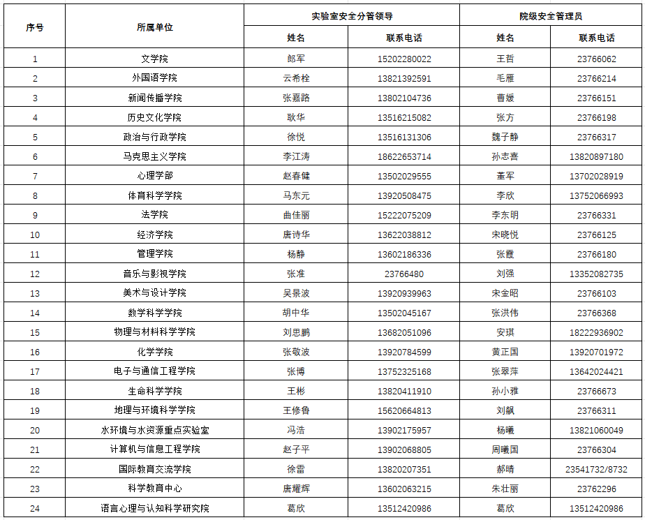 各单位实验室安全分管领导和安全管理员联络表